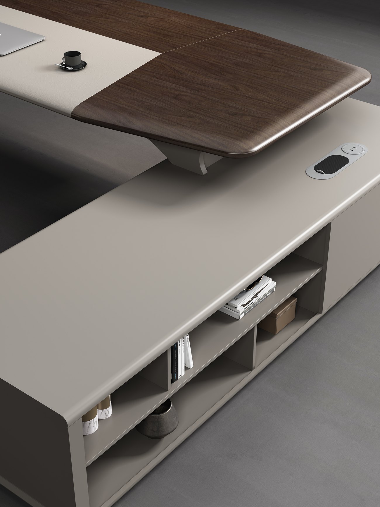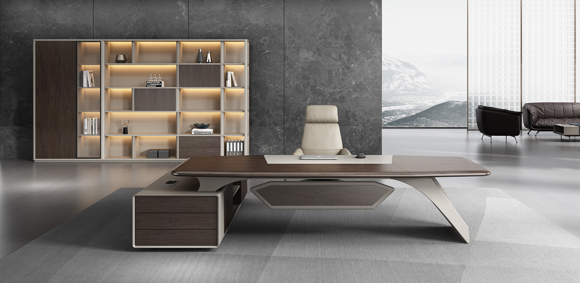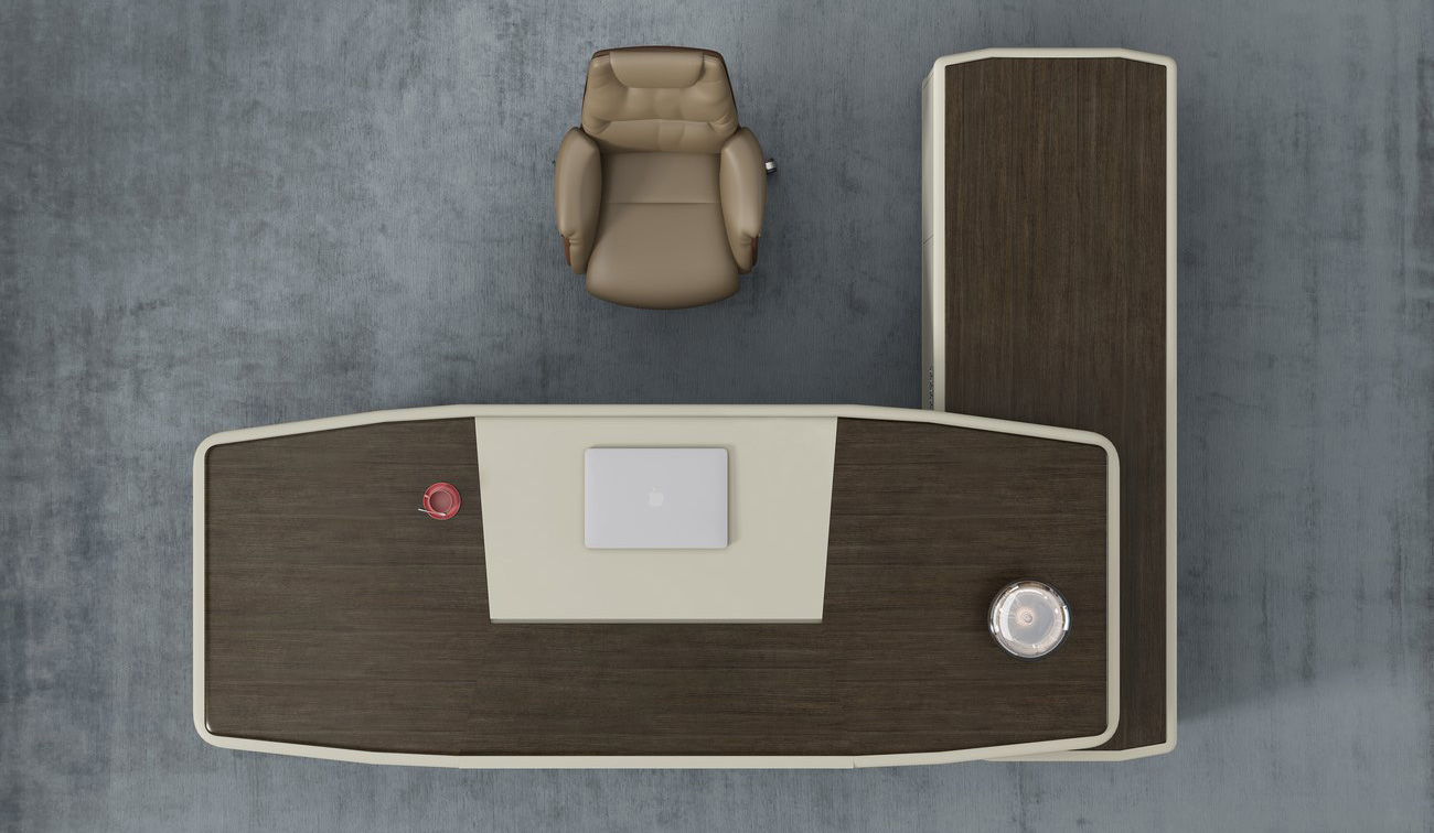 整体设计元素来自于名酒包装设计, 圆润的线条加上钻石切割工艺使整个班台线条流畅造型美观, 台脚采用玻璃钢一次成型, 无论是外观和稳定性都体现了富豪制作工艺的精湛和设计领先,超宽台面设计使其整个外形大气美观, 而人体接触面则采用包皮设计, 接触时温馨舒适, 副柜采用了指纹锁和超级电源, 科技满满的配置极大的满足了客户需求, 同时也提升了产品的整体定位和档次, 配套的书柜同样采用的配件也是高级的五金和玻璃, 暖色的灯带更是为办公空间缓解了一天的劳累。