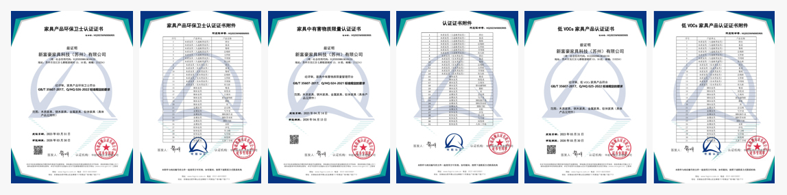 具有家具产品环保卫士认证、家具中有害物质限量认证、低VOCs家具产品认证等